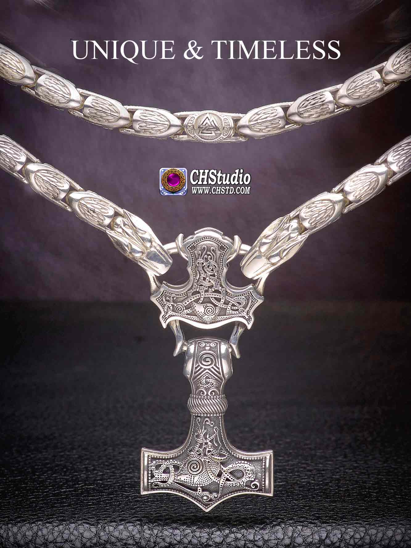 THOR’S HAMMER : MJOLNIR with VALKNUT :: Ravens Chain Necklace – Silver plated -